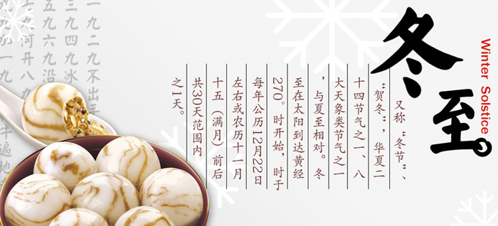 冬至(Winter Solstice),是中國農歷中一個重要的節氣,也是中華民族的一個傳統節日,冬至俗稱“冬節”、“長至節”、“亞歲”等。早在二千五百多年前的春秋時代,中國就已經用土圭觀測太陽,測定出了冬至,它是二十四節氣中最早制訂出的一個,時間在每年的公歷12月21日至23日之間。冬至這天,太陽直射地面的位置到達一年的最南端,幾乎直射南回歸線(南緯23°26')。這一天北半球得到的陽光最少,比南半球少了50%。北半球的白晝達到最短,且越往北白晝越短。冬至過后,夜空星象完全換成冬季星空,而且從今天開始“進九”。而此時南半球正值酷熱的盛夏。比較常見的是,在中國北方有冬至吃餃子的風俗。俗話說:“冬至到,吃水餃。”而南方則是吃湯圓,當然也有例外,如在山東滕州、曲阜、鄒城,冬至習慣叫做數九,流行過數九當天喝羊肉湯的習俗,寓意驅除寒冷之意。